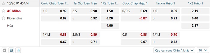 Bảng tỷ lệ kèo bóng đá hôm nay AC Milan vs Fiorentina