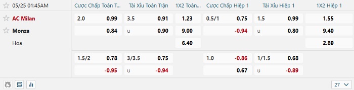 Bảng tỷ lệ kèo bóng đá AC Milan vs Monza