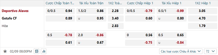 Bảng tỷ lệ kèo bóng đá Alaves vs Getafe