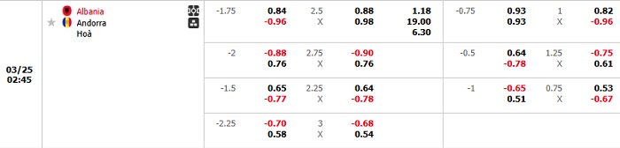 Bảng tỷ lệ kèo bóng đá Albania vs Andorra