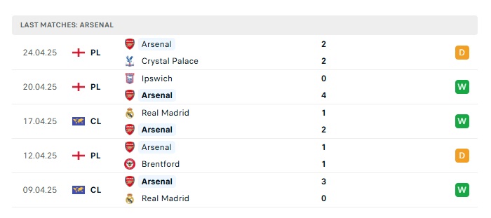 Phong độ gần đây Arsenal vs PSG