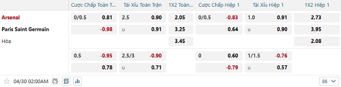 Bảng tỷ lệ kèo bóng đá hôm nay Arsenal vs PSG