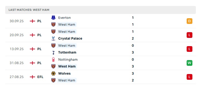 • Phong độ gần đây West Ham Utd