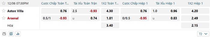 Bảng tỷ lệ kèo nhà cái Aston Villa vs Arsenal