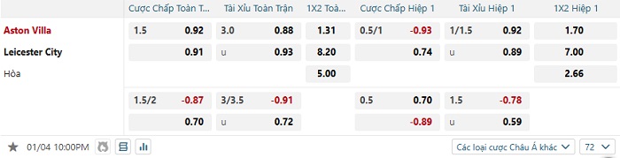 Bảng tỷ lệ kèo bóng đá Aston Villa vs Leicester City