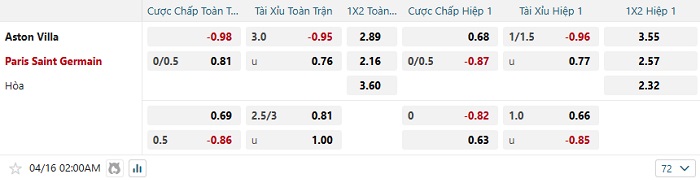 Soi kèo châu Á, kèo Aston Villa vs PSG