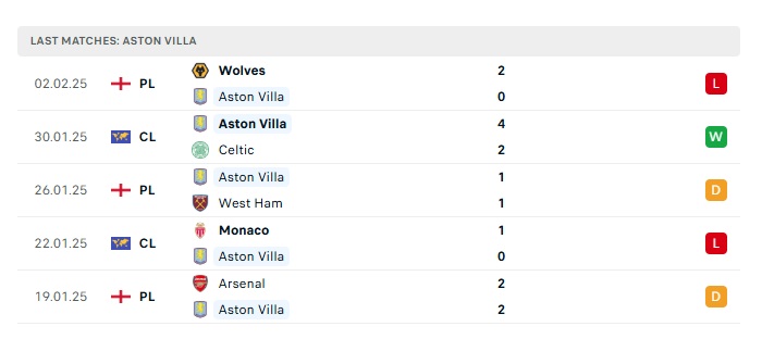 - Phong độ gần đây Aston Villa