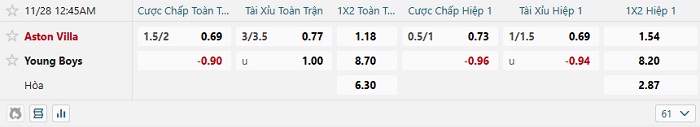 Bảng kèo bóng đá Aston Villa vs Young Boys