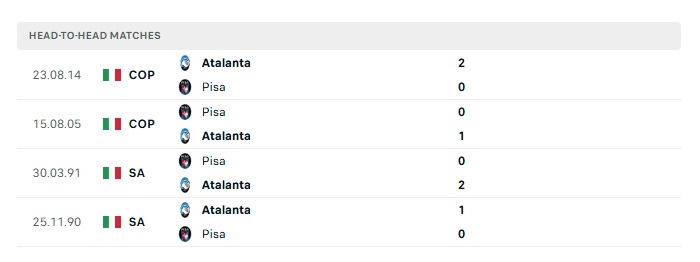 - Kèo tỷ số H2 Atalanta vs Pisa: 2-0