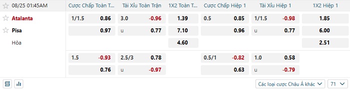 Soi kèo châu Á, kèo Atalanta vs Pisa