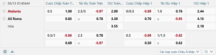 Bảng tỷ lệ kèo nhà cái Atalanta vs Roma