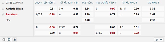 Bảng kèo bóng đá Athletic Bilbao vs Barcelona