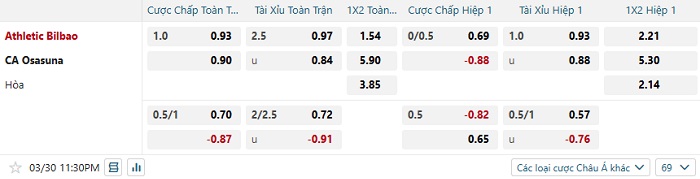Bảng tỷ lệ kèo bóng đá Athletic Bilbao vs Osasuna