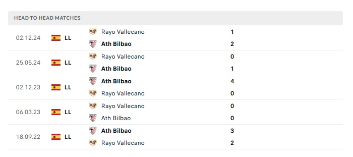 Lịch sử đối đầu Athletic Bilbao vs Rayo Vallecano