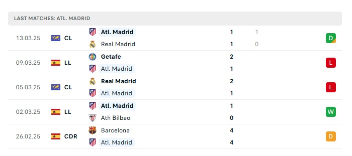 Phong độ gần đây Atletico Madrid vs Barcelona