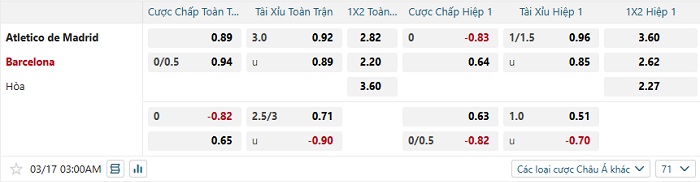 Bảng tỷ lệ kèo bóng đá Atletico Madrid vs Barcelona