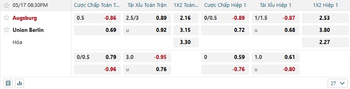 Bảng tỷ lệ kèo bóng đá Augsburg vs Union Berlin