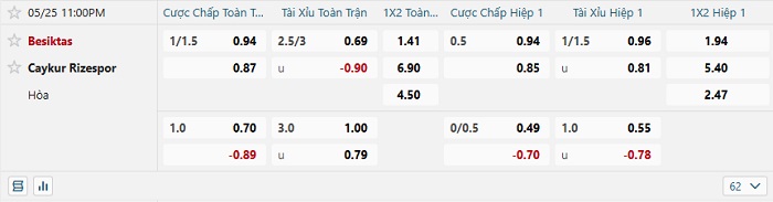 Bảng tỷ lệ kèo nhà cái Besiktas vs Rizespor