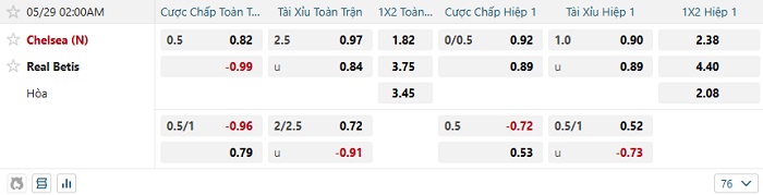 Bảng tỷ lệ kèo bóng đá Betis vs Chelsea
