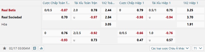 Bảng tỷ lệ kèo bóng đá Betis vs Real Sociedad