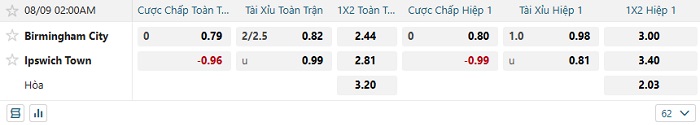 Bảng tỷ lệ kèo nhà cái Birmingham vs Ipswich