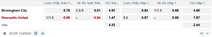 Bảng tỷ lệ kèo bóng đá Birmingham vs Newcastle