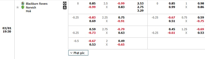 Bảng tỷ lệ kèo bóng đá Blackburn Rovers vs Norwich