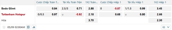 • Kèo tỷ số H2 Bodo Glimt vs Tottenham: 0-1