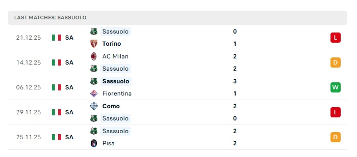 • Phong độ gần đây Sassuolo
