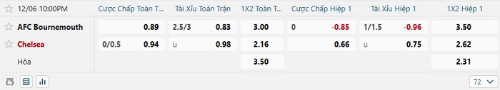 Bảng kèo bóng đá Bournemouth vs Chelsea