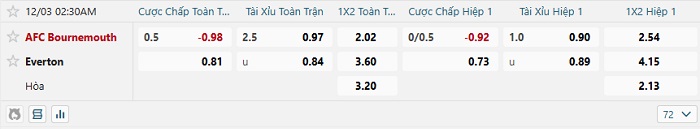 Bảng tỷ lệ kèo bóng đá Bournemouth vs Everton