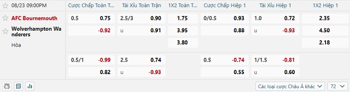 Bảng kèo bóng đá Bournemouth vs Wolves