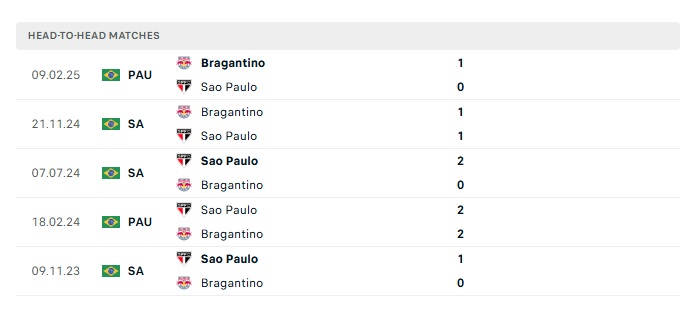 Lịch sử đối đầu Bragantino vs Sao Paulo