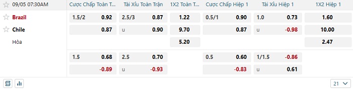 Bảng tỷ lệ kèo bóng đá hôm nay Brazil vs Chile