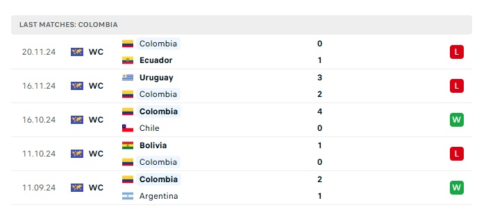 - Phong độ gần đây Colombia