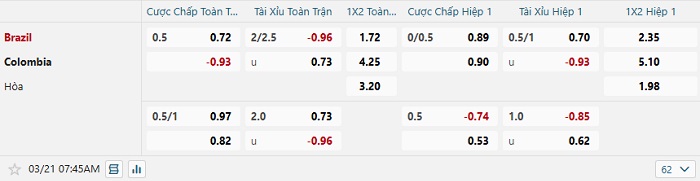 Bảng tỷ lệ kèo bóng đá Brazil vs Colombia