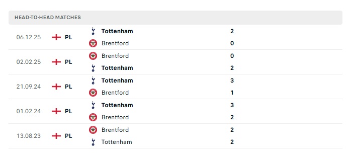 Lịch sử đối đầu Brentford vs Tottenham
