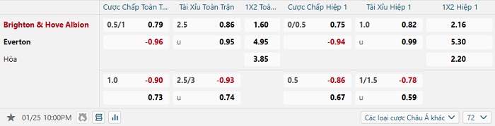 Bảng tỷ lệ kèo bóng đá Brighton vs Everton
