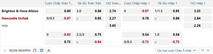 Bảng tỷ lệ kèo bóng đá Brighton vs Newcastle