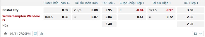 Bảng tỷ lệ kèo bóng đá Bristol City vs Wolves