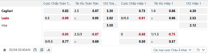 Bảng tỷ lệ kèo bóng đá Cagliari vs Lazio