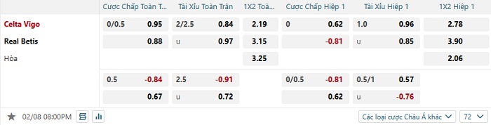 Bảng tỷ lệ kèo bóng đá Celta Vigo vs Real Betis