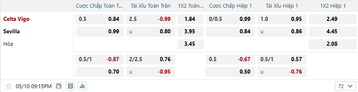 • Kèo tỷ số H1 Celta Vigo vs Sevilla: 1-0
