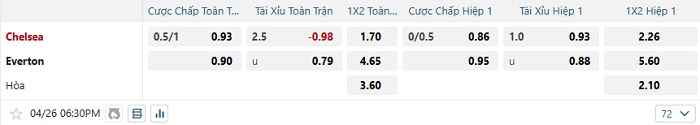 Bảng tỷ lệ kèo bóng đá Chelsea vs Everton