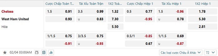 Bảng tỷ lệ kèo bóng đá Chelsea vs West Ham