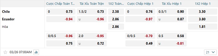Bảng tỷ lệ kèo bóng đá Chile vs Ecuador