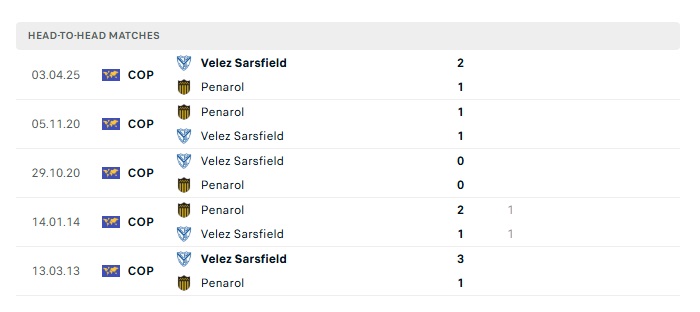 Lịch sử đối đầu Club Atletico Penarol vs Velez Sarsfield
