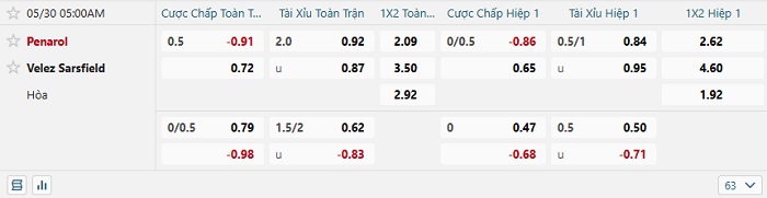 Bảng tỷ lệ kèo bóng đá Club Atletico Penarol vs Velez Sarsfield