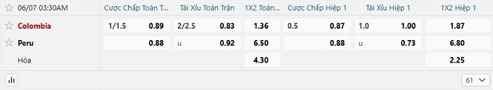Bảng tỷ lệ kèo nhà cái Colombia vs Peru