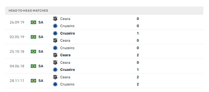 Lịch sử đối đầu Cruzeiro vs Ceara